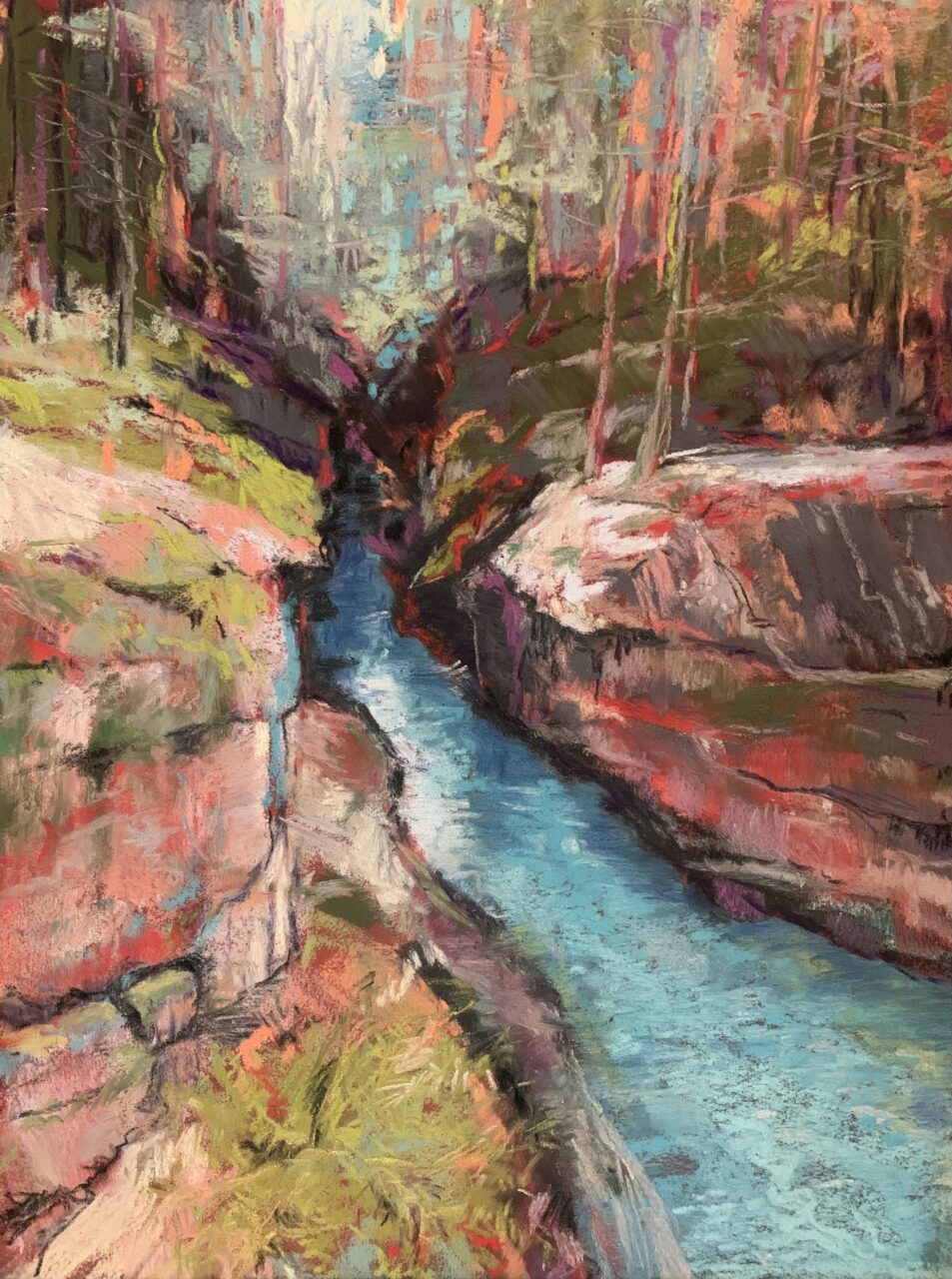 A stroll along the stream – Pastel on board, 11 1/2” x 8 1/2”, $ 400. 3rd place OPAL 2022, Bryn du Artshow 2024